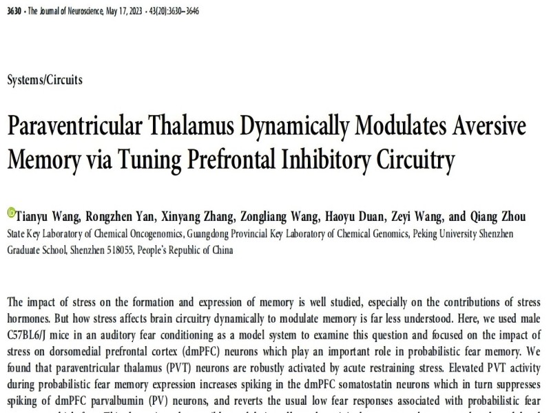 J Neurosci︱北大深圳研究生院周強(qiáng)實(shí)驗(yàn)室解析急性壓力調(diào)控恐懼記憶的神經(jīng)環(huán)路機(jī)制