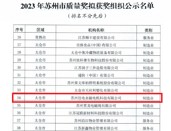 近日,蘇州市質(zhì)量獎評定委員會公示2023年蘇州市質(zhì)量獎評定結(jié)果,蘇州佳電永磁電機(jī)科技有限公司(以下簡稱“蘇州佳電”)憑借著在戰(zhàn)略規(guī)劃、核心技術(shù)構(gòu)建、經(jīng)營理念、質(zhì)量體系等方面的優(yōu)秀表現(xiàn),經(jīng)過層層嚴(yán)格評審,得到了質(zhì)量評定委員會的高度認(rèn)可,獲評“蘇州市質(zhì)量獎”榮譽稱號。