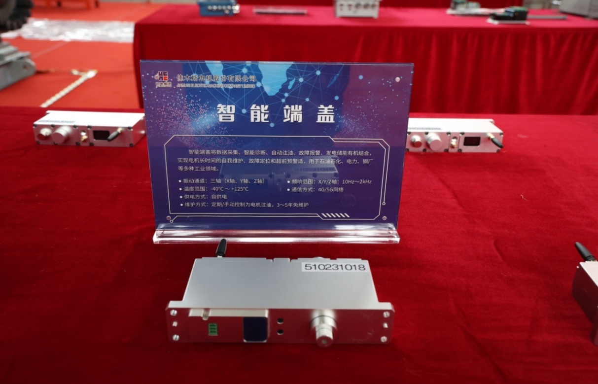 此次發布會展出的智能端蓋,端蓋內置發電機,為邊緣智能終端供電,無需外接電源,解決續航問題,邊緣智能終端嵌入安裝端蓋中,實時采集振動、溫度數據,數據采集更精準,對多種故障實現早期預警及智能診斷,該端蓋專為各類高、低壓電動機設計,適用于各類工業場景。
