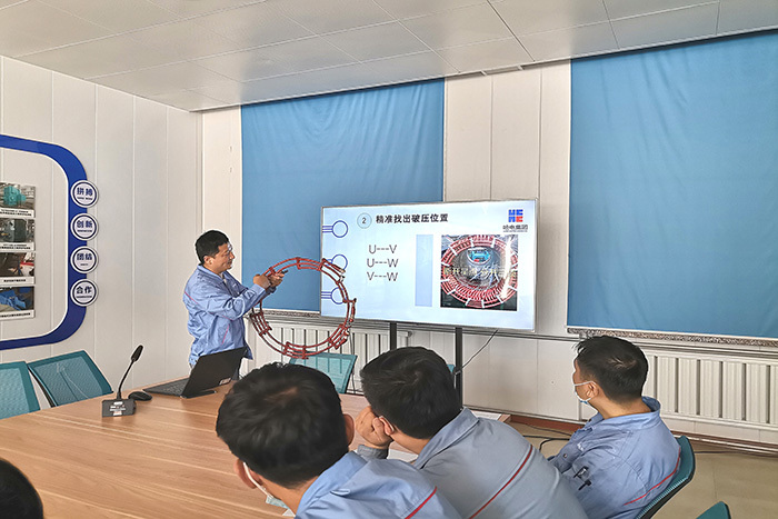 佳電股份高級技師、電工車間接線工成明坤以實際案例向職工詳細講解了繞組接線的重要性以及常規三相接線圓圖的繪制,通過自己制作的接線線路實物,詳細地向大家分享了快速尋找破壓點的小竅門,僅需要一個萬用表和一把斷線剪,通過分相→分組→分頭就能快速找到故障位置。