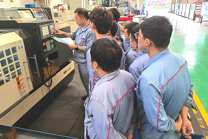 佳電股份技師、屏蔽車間數控車工吳先聞在數控車床前,有針對性地圍繞識圖基礎、刀具選擇,數控刀具涂層材料區別以及切削用量等方面進行實操培訓,并對操作過程中的常見問題進行分析講解,促進產品質量和生產效率提高。