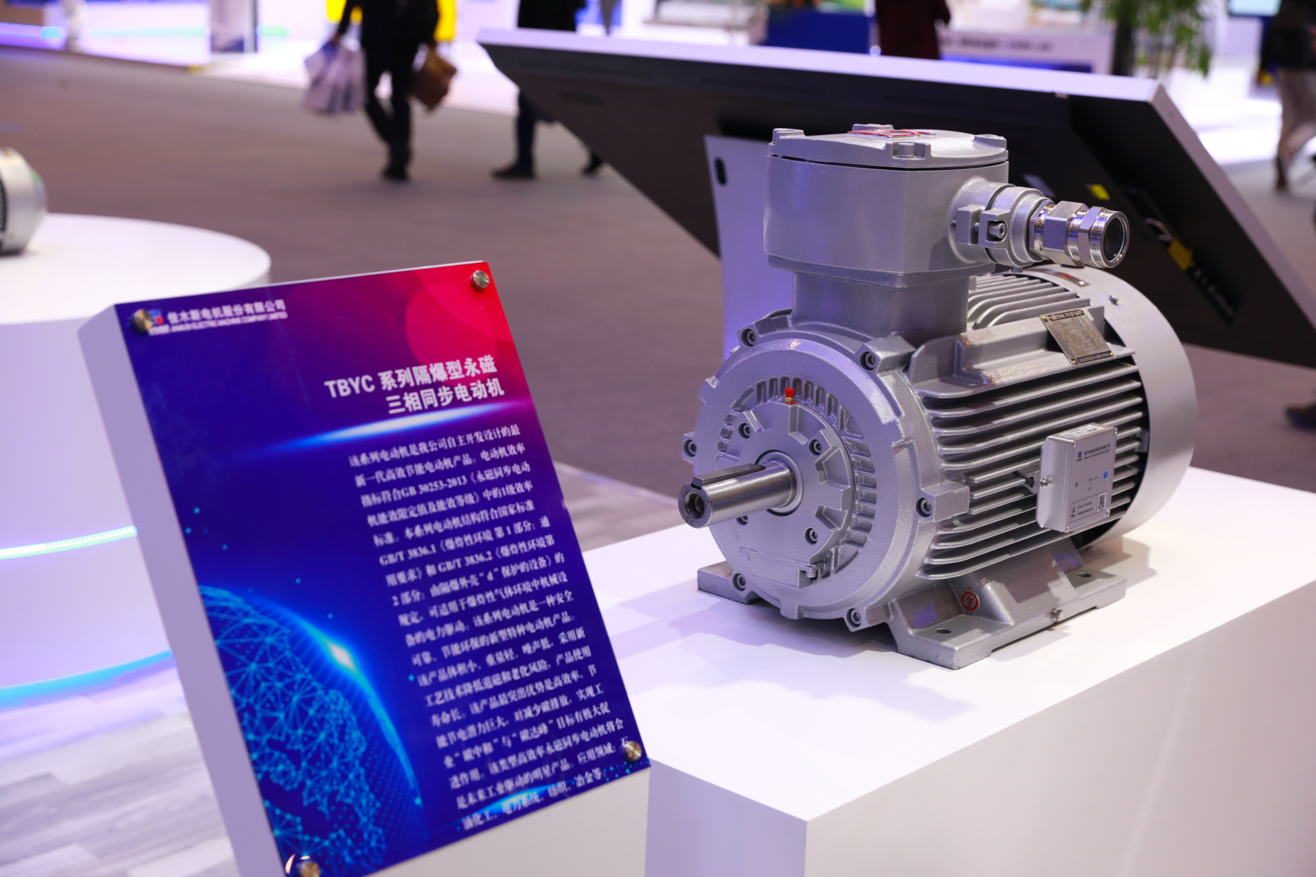 本次參展的T(B)YC系列常規永磁電機、T(B)YCP系列低速直驅永磁電機、T(B)YCG 系列高速直驅永磁電機三個系列產品,依靠永磁體所提供的磁能替代了傳統電機電勵磁產生的磁能,具備電機損耗低、運行可靠性高的特點。在負載較低時,產品仍可保持較高的運行效率和功率因數,解決了機械設備在低負荷時能耗消耗大的問題。其中高低速直驅永磁電機改變了傳統的驅動方式,取消了減速機、齒輪箱等變速機構,降低了傳動損耗,系統節能可達20%以上,同時減少了整個系統的故障點,大大提高了傳動系統的效率和可靠性,是工信部“能效之星”推薦產品。
