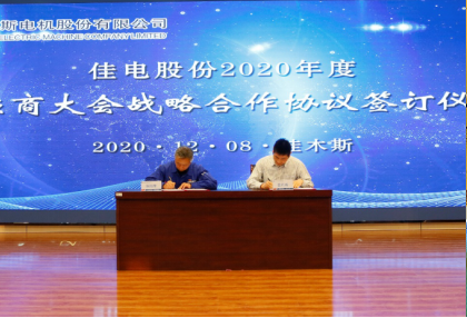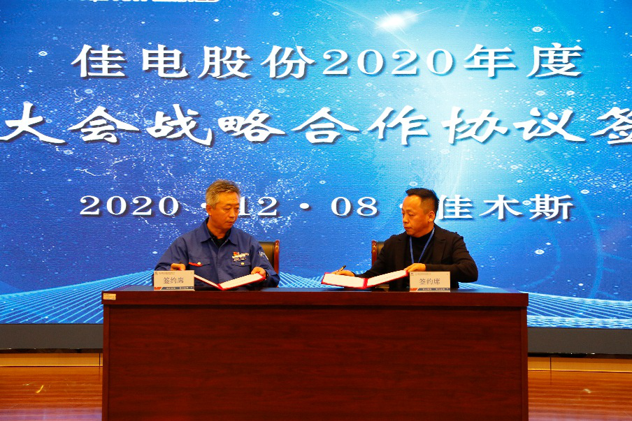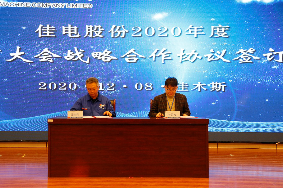 姜清海代表佳電股份與杭州華光、遼寧東港、申科股份三家戰略供應商代表簽訂戰略合作協議。