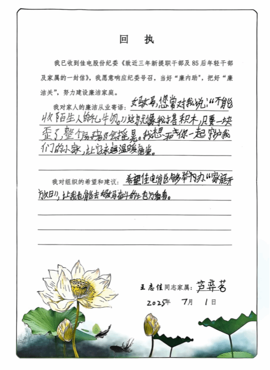 佳電股份將廉潔教育觸角延伸至“家庭”陣地,向近三年新提職干部、85后年輕干部及其家屬同步發放《家庭助廉倡議書》與《給年輕干部提個醒》廉潔讀本。倡議書中既有黨紀法規解讀,又含溫情寄語,旨在以家庭“小港灣”筑牢企業“大防線”。活動中,黨員干部與家屬共同研讀、深刻感悟,家屬們紛紛回信,字里行間滿是“廉潔齊家”的囑托與“慎終如始”的期許,讓清廉家風在企業中傳遞。