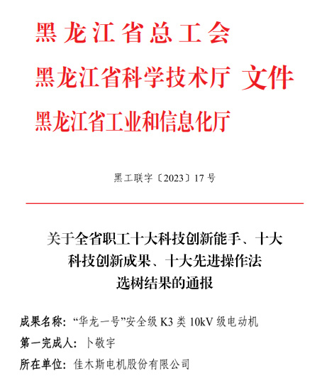 近日,黑龍江省總工會、省科學技術廳、省工業和信息化廳發布了全省職工“十大科技創新能手、十大科技創新成果、十大先進操作法”選樹名單,哈爾濱電氣集團佳木斯電機股份有限公司(以下簡稱“佳電股份”)《“華龍一號”...
