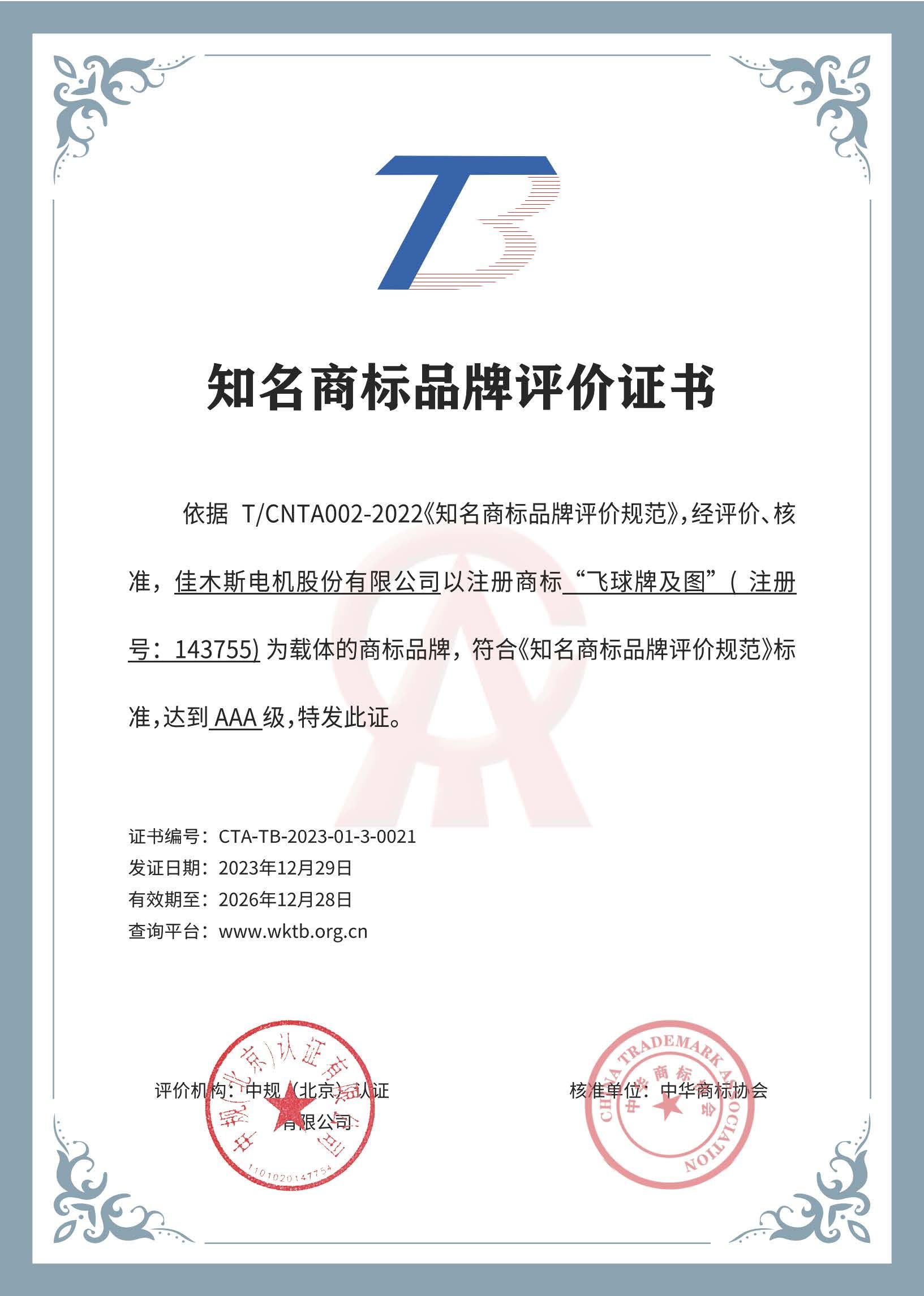 近日,經(jīng)中華商標協(xié)會和中規(guī)(北京)認證有限公司AAA級知名商標品牌評價審核,哈電集團佳木斯電機股份有限公司(以下簡稱“佳電股份”)“飛球牌”商標順利通過AAA級(國家級)知名商標品牌認證,成為行業(yè)內(nèi)首家獲得此榮譽的單位。...